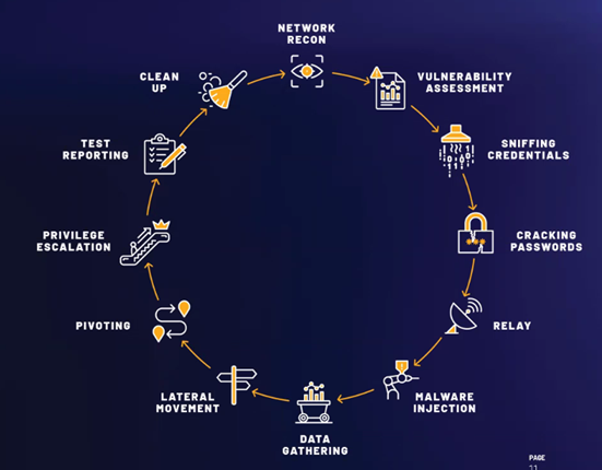 Khi thâm nhập vào hệ thống, Pentera sẽ tiến hành nhận diện hệ thống mạng (Network Recon), dò quét các lỗ hổng bảo mật. Sau đó, giải pháp sẽ tiến hành kiểm thử các lỗ hổng đó với tập hành vi giống với các attacker ngoài thực tế ( lấy các thông tin về user, cracking password, relay attack, malware injection,…) để có thể xác định và khai thác hệ thống để xác thực được rằng liệu các lỗ hổng dò quét được sẽ có tác động ảnh hưởng như thế nào đến hệ thống.