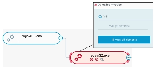 Sau đó, Emotet cho chạy tệp DLL Emotet đã sao chép bằng tiện ích Windows regsvr32. Quan sát thấy rằng regsvr32 ánh xạ DLL Emotet dưới tên nội bộ của Y.dll. Người dùng Nền tảng Cybereason XDR có thể xem tên này là tên của mô-đun thực thi trong ngữ cảnh của regsvr32v.