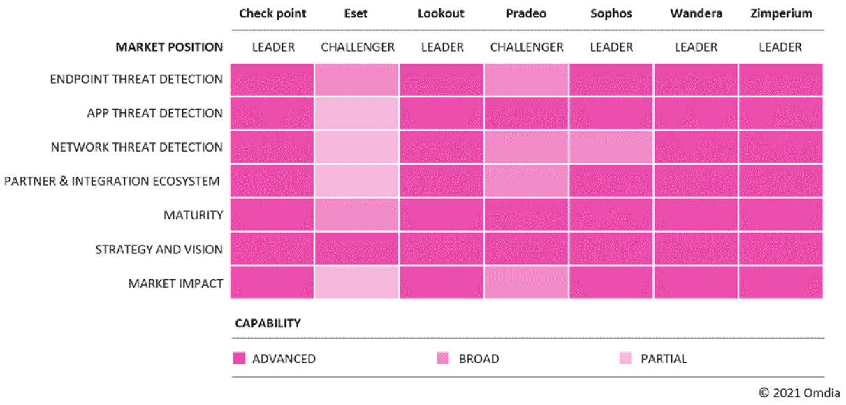 Giải pháp Check Point Harmony Mobile do Vina Aspire cung cấp được đánh giá ở vị trí đầu vì khả năng tiên tiến của mình trên tất cả các danh mục, như trong Heatmap Omdia dưới đây.