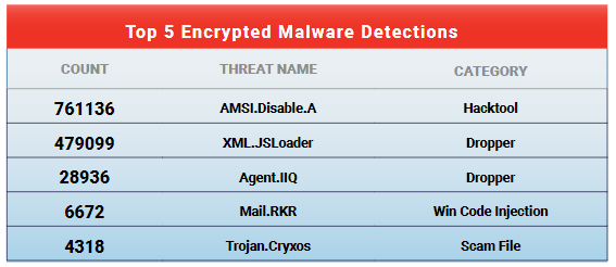 Báo cáo mới nhất của WatchGuard Technologies về những phát hiện trong hệ thống làm việc từ xa của mình, cũng cho thấy rằng những phát hiện này chủ yếu đến từ hai họ phần mềm độc hại: AMSI.Disable.A, được phát hiện lần đầu tiên vào Q1; và phần mềm độc hại cũ hơn được gọi là XML.JSLoader. Cùng với nhau, chúng tạo nên hơn 90% các phát hiện qua HTTPS và hơn 12% tổng số phát hiện, theo báo cáo.