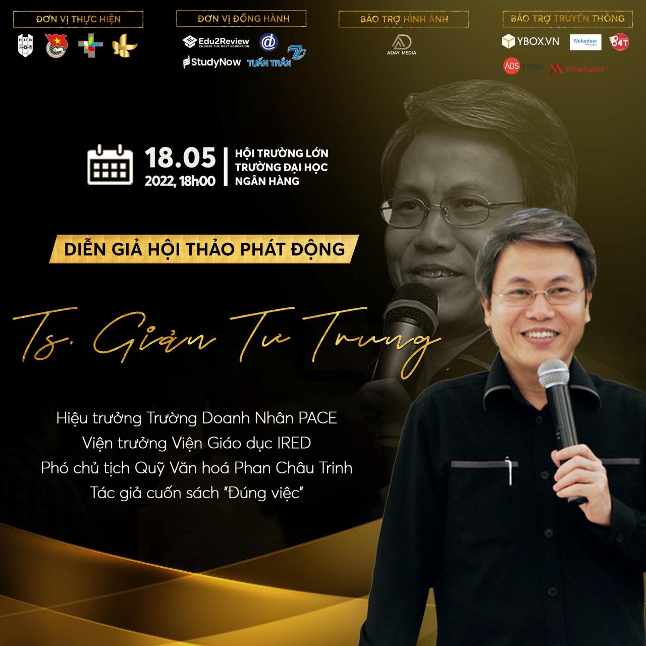 Đến với buổi Hội thảo Phát động vào lúc 18h00, thứ tư ngày 18.05.2022, cùng chủ đề “TÌM MÌNH VÀ CHỌN NGHỀ THỜI BIẾN ĐỘNG”, chúng mình vinh dự được đồng hành cùng Thầy Giản Tư Trung; hiệu trưởng Trường doanh nhân Pace; Viện trưởng Viện Giáo dục IRED; Phó Chủ tịch Quỹ Văn hóa Phan Châu Trinh; tác giả cuốn sách “Đúng việc – Một Góc Nhìn Về Câu Chuyện Khai Minh”. Với sự đồng điệu về phát triển sự học và sự tử tế, thầy Giản Tư Trung một lần nữa cùng Say to Succeed tiếp nối và lan tỏa những giá trị đó.