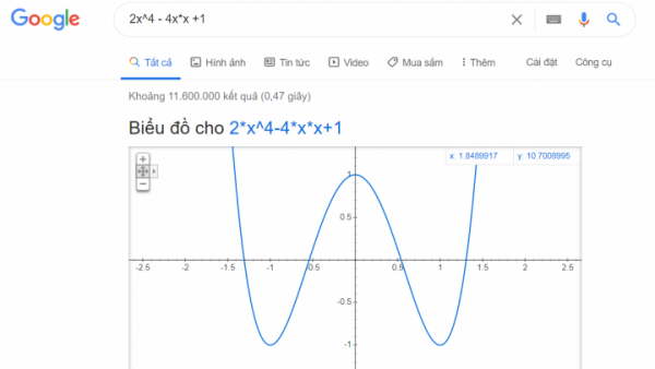 Google Search không chỉ tính toán từ biểu thức cộng trừ nhân chia, đến mũ, căn nhiều bậc hay sin-cos-tan mà còn có thể trả về kết quả đồ thị hàm số. Tuy nhiên, bạn cần lưu ý là Google Search không dùng các ký hiệu toán học dạng hình mà dùng dạng chữ. Chẳng hạn như sqrt(x) cho căn bậc 2 thay vì ⎷(x), hay abs(x) thay cho |x|.