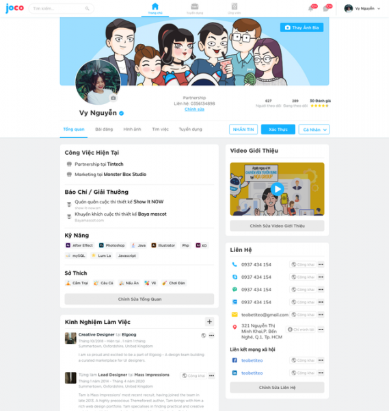 Thay vì phải tạo một CV khô khan hay một trang Web rời rạc, nhà tuyển dụng và ứng viên có thể tự tạo cho mình một trang hồ sơ trực tuyến nổi bật với sự đan xen giữa thông tin chuyên nghiệp và hình ảnh bắt mắt được trình bày theo bố cục hiện đại tại JOCO. Đồng thời, với việc được tập trung tại cùng một nơi, các trang hồ sơ này có thể dễ dàng được các ứng viên và nhà tuyển dụng khác tìm thấy thông qua các mục gợi ý, danh sách và newsfeed mỗi ngày. Việc này sẽ giúp cả ứng viên và nhà tuyển dụng có nhiều cơ hội tự tối ưu và gia tăng sức mạnh thương hiệu tuyển dụng & thương hiệu cá nhân của chính mình mà không bị ảnh hưởng bởi các luồng thông tin khác hay bị gò bó trong khuôn mẫu chuyên nghiệp, tiếng Anh như trong những trang mạng xã hội việc làm nước ngoài khác.