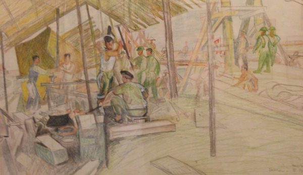 Tác phẩm “Bộ đội xây dựng cầu” hiện đang được trưng bày tại Bảo tàng Mỹ thuật Việt Nam. Ảnh Hương -Cinet