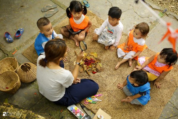 Còn “giờ học” mỹ thuật của lũ trẻ thì sao? Chúng phải tự đi kiếm chất liệu cho bài học của mình trong khắp khu vườn, bạn được giao nhặt lá khô, bạn được phân công nhặt hoa rơi, bạn thì nhặt cành gãy, thế là mỗi bạn một chiếc giỏ tre, tha thẩn khắp trường “làm nhiệm vụ”. Kiếm đủ nguyên liệu, tất cả tụ lại quanh cô để tô màu lên lá cây, được cô hướng dẫn đính lá, đính hoa lên bìa để làm thành một bức tranh theo trí tưởng tượng của mình. Một giờ học diễn ra tự nhiên, đầy ắp niềm vui và sự chủ động của các bạn nhỏ.