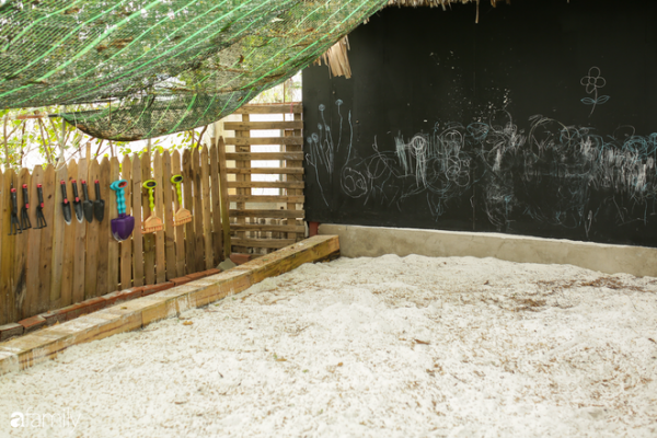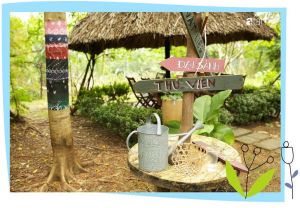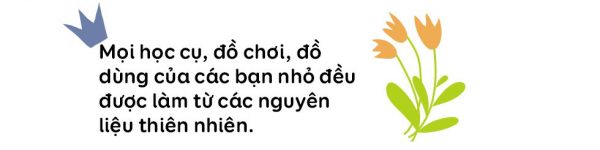 Còn “giờ học” mỹ thuật của lũ trẻ thì sao? Chúng phải tự đi kiếm chất liệu cho bài học của mình trong khắp khu vườn, bạn được giao nhặt lá khô, bạn được phân công nhặt hoa rơi, bạn thì nhặt cành gãy, thế là mỗi bạn một chiếc giỏ tre, tha thẩn khắp trường “làm nhiệm vụ”. Kiếm đủ nguyên liệu, tất cả tụ lại quanh cô để tô màu lên lá cây, được cô hướng dẫn đính lá, đính hoa lên bìa để làm thành một bức tranh theo trí tưởng tượng của mình. Một giờ học diễn ra tự nhiên, đầy ắp niềm vui và sự chủ động của các bạn nhỏ.