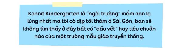 Khi đặt những bước chân đầu tiên vào Konnit, tôi thầm nghĩ “Thật giống một khu nghỉ dưỡng!”. Không tiếng nhạc “thùng thình” đổ ra từ những chiếc loa lớn tôi vẫn nghe thấy khi đi qua các trường mầm non vào buổi sáng, không cảnh các cô giáo xếp hàng ở cổng trường để bế ẵm đón trẻ vào lớp, cũng không có màn lũ nhóc khóc lóc bấu chặt lấy bố mẹ nước mắt giàn dụa “con không đi học đâu”… Các bạn nhỏ ở Konnit được bố mẹ thả ở cổng trường rồi tự mình kéo balo đi trên con đường đá ngoằn ngoèo vào trong trường, cất balô rồi ra ăn sáng cùng các bạn, một cách chủ động và nhanh nhẹn.