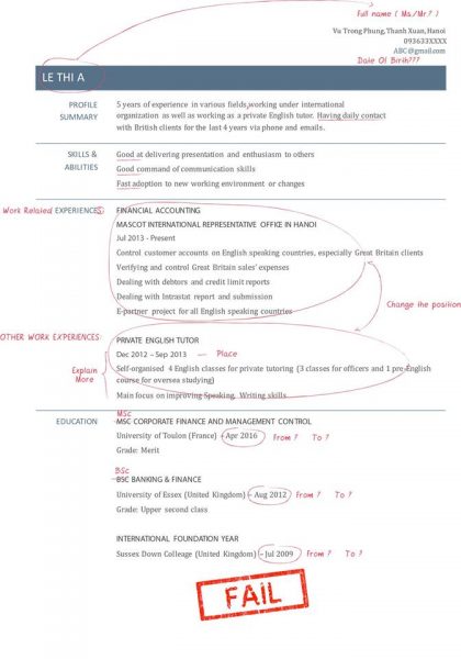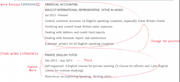 – Để thứ tự công việc không hợp lí: Thông thường, ứng viên nên để thứ tự công việc gần nhất tới xa dần. Tuy nhiên đối với trường hợp ứng viên này, do công việc hiện tại không hề liên quan tới công việc đang apply (English teacher), do đó ứng viên nên đảo vị trí 2 công việc để nhà tuyển dụng thấy ngay sự phù hợp của bản thân.