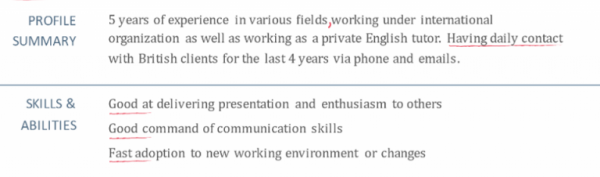 – Phần profile summary của bạn này không hề nổi bật, bạn chỉ nói lên mình đã từng có 5 năm làm việc ở “nhiều lĩnh vực” ở các tổ chức quốc tế (chưa biết quy mô tổ chức như thế nào)