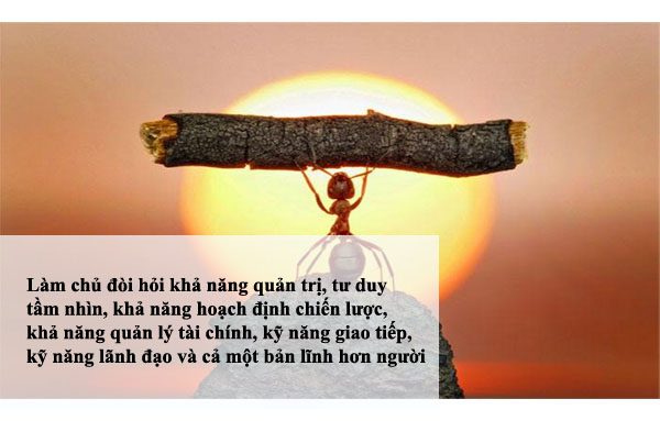 Nó đòi hỏi khả năng quản trị, tư duy, tầm nhìn, khả năng hoạch định chiến lược, quản lí tài chính, kĩ năng giao tiếp, kĩ năng lãnh đạo và cả một bản lĩnh hơn người. Làm chủ một quán cà phê sân vườn hay làm chủ một công ty lớn đều cần những thứ trên – nếu bạn thực sự muốn đứa con của mình phát triển. Nhưng đó mới chỉ là điều kiện cần chứ chưa bao gồm điều kiện đủ. Nghĩa là một người với đầy đủ những phẩm chất trên cũng chưa chắc đã có thể làm nên chuyện lớn.