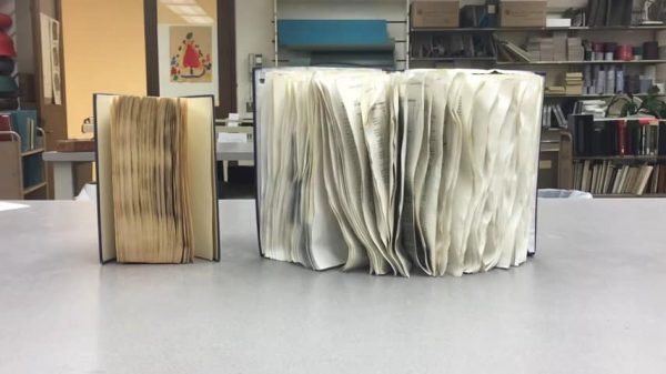 Nếu không kịp thời hoặc không biết cách ứng cứu, cuốn sách của bạn có thể sẽ bị cong, hỏng như cuốn sách ở hình trên (bên phải). (Ảnh chụp video)