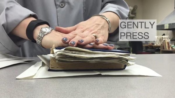 – Bước 4: Khi chèn giấy được 1/2 cuốn sách, gấp sách lại và dùng tay ấn nhẹ cuốn sách. Sau khi các tờ giấy se lại, bỏ khăn giấy ở phần sách đó ra, chèn khăn giấy vào những trang còn lại. Lặp lại thao tác trên cho đến khi thấm xong toàn bộ cuốn sách.