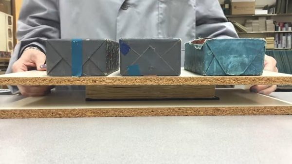 – Bước 6: Sau khi làm khô sách, dùng hai tấm ván gỗ ép chặt cuốn sách vào giữa. Có thể dùng máy ép chuyên dụng hoặc dùng một số vật nặng như gạch để gia tăng sức ép lên cuốn sách, giúp làm thẳng trang sách. Để như vậy từ 1-2 ngày.