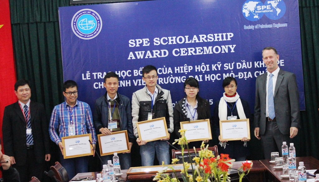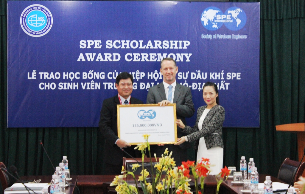 Được biết, SPE là một trong những đối tác truyền thống có mối quan hệ hợp tác thân thiết với trường Đại học Mỏ – Địa chất. Trong những năm qua SPE đã có những đóng góp rất lớn trong sự nghiệp khuyến học đối với sinh viên trường Đại học Mỏ – Địa chất nói chung và sinh viên Khoa Dầu khí nói riêng. SPE đã dành những suất học bổng trị giá hàng trăm triệu đồng tặng các bạn sinh sinh viên có thành tích học tập xuất sắc, trong đó bao gồm tiền mặt và các suất học bổng Tiếng Anh.