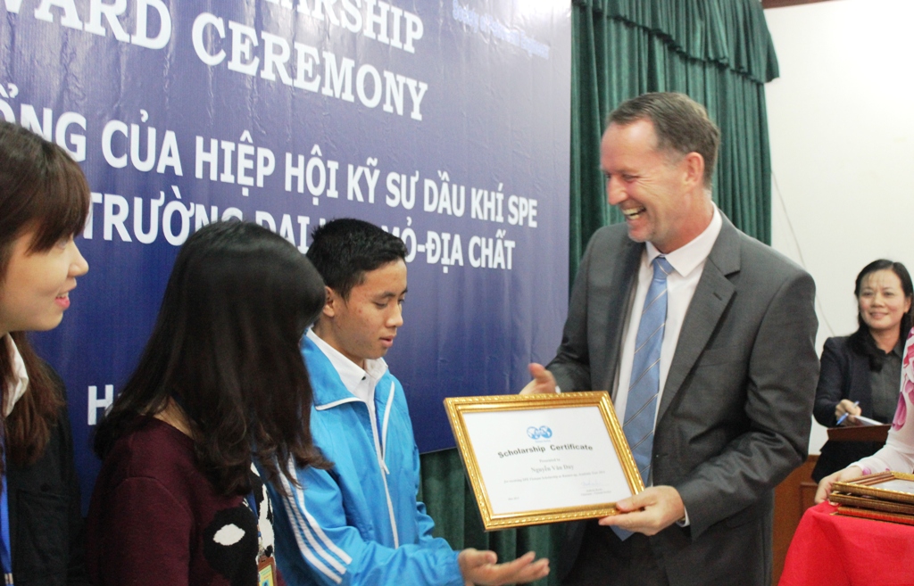 Chủ tịch SPE Việt Nam, ông Tony Roche trao học bổng cho các sinh viên trường ĐH Mỏ – Địa chất