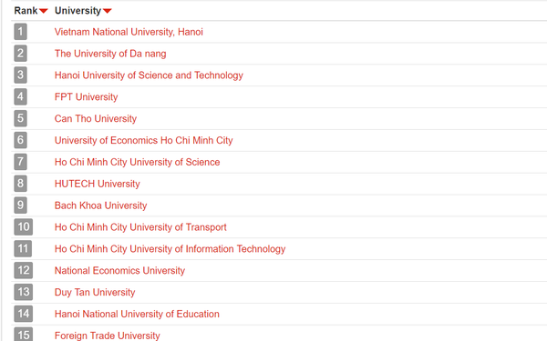 Theo đó, Đại học Quốc gia Hà Nội xếp đầu bảng, đứng ở các vị trí tiếp theo trong top 15 lần lượt là: