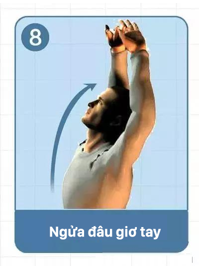 Giơ hai tay lên cao quá đầu, các ngón tay đan chéo, bàn tay hướng lên trên. Ngửa hết cỡ đầu, mắt nhìn bàn tay, giữ nguyên trong khoảng 5 giây.