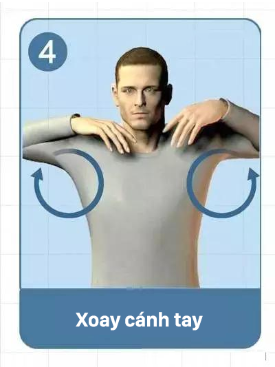 Để tay gập buông nhẹ trên vai, úp lòng bàn tay xuống dưới, quay về phía trước 20-30 cái, quay ngược lại ra phía sau 20-30 lần