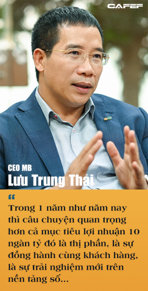 Nhiều ngân hàng đang có lợi thế về số hoá hoặc nền tảng khách hàng, MB có tin sẽ vượt lên trong công cuộc cạnh tranh này?Chúng tôi tự tin về một số việc, nhưng về tổng thể đặt mục tiêu vượt qua họ không phải chiến lược phù hợp. Hiện quy mô của các ngân hàng lớn đang gấp đôi của MB, nhưng các chính sách kinh doanh và kiểm soát tốc độ tăng trưởng của họ đang tạo ra nhiều cơ hội cho các ngân hàng khác, trong đó có MB. Bên cạnh đó, công cuộc chuyển đổi số của đất nước sẽ tạo ra cơ hội mới cho các ngân hàng. To hơn không còn quan trọng mà nhanh hơn, thông minh hơn sẽ quan trọng hơn.