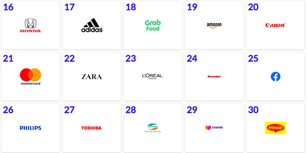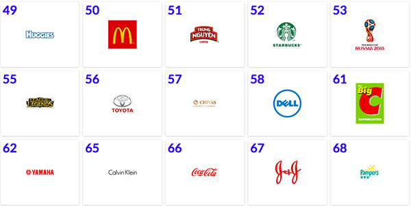 Danh sách hơn 100 thương hiệu hàng đầu Việt Nam năm 2021 theo số liệu của Campaign Asia-Pacific và Nielsen bao gồm: