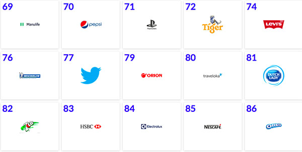 * Bảng xếp hạng dựa trên việc các công ty nghiên cứu yêu cầu người trả lời (người tiêu dùng) lựa chọn các thương hiệu hàng đầu có hoạt động tại Việt Nam, có danh tiếng tốt nhất và gây được tiếng vang lớn nhất với người Việt Nam.
