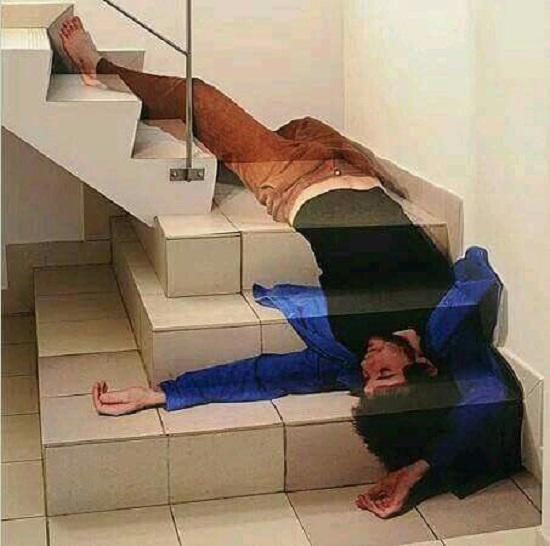 Nếu có tình cờ gặp cảnh tượng này thì cũng đừng giật mình nhé, chỉ là một tác phẩm nghệ thuật quá chân thực trên nền bậc cầu thang thôi mà.
