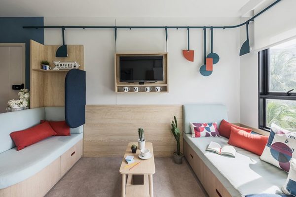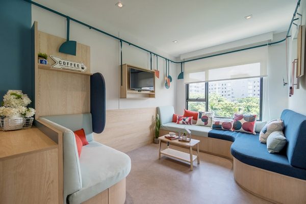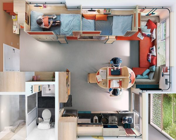 Thiết kế thông minh này thực sự là một giải pháp nhà ở tuyệt vời, giúp cho sinh viên sử dụng hiệu quả và tận dụng được hết không gian trong căn hộ, tiết kiệm diện tích bằng hệ thống chứa đồ ẩn bên dưới giường và ghế, cùng với nội thất và đồ dùng thực tiễn, tiện nghi.