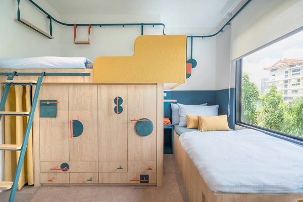 Fabrica có những nghiên cứu sâu rộng về triết lý co–living – một mô hình sống hiện đại với những không gian chung được chia sẻ. Phòng ngủ chung với giường ngủ bố trí hợp lý, sử dụng được không gian ngay dưới gầm để làm tủ chứa đồ hết sức tiện lợi. Phòng ngủ tràn ngập ánh sáng, có thể nhìn ngắm đất trời qua ô cửa kính to.