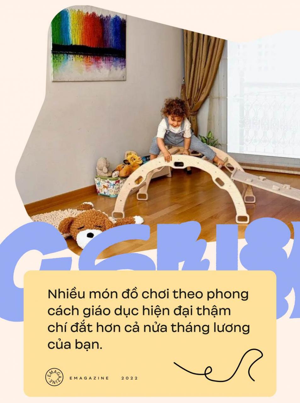 Lấy ví dụ như đồ chơi. Sau khi Annie mang thai, trong số các quảng cáo đầu tiên mà cô thấy là những món đồ chơi cao cấp mang thương hiệu Lovevery. Chúng được tuyên bố cung cấp “những thứ cần thiết cho việc chơi theo từng giai đoạn cho trí não đang phát triển của con bạn”, và phiên bản dành cho trẻ sơ sinh có giá 80 USD một hộp. Khi đọc cái này, cô ngay lập tức cảm thấy tội lỗi vì không sở hữu chúng. Các công ty khác thì bán nhiều loại đồ chơi được làm thủ công đẹp mắt trên thị trường như một phần của các phương pháp giáo dục mầm non nổi tiếng như Montessori hoặc Waldorf, đôi khi với giá hơn 100 USD một món đồ. Bình luận để lại từ những gia đình giàu có đã mua chúng cho thấy những món đồ như thế này thường được trưng bày trong những khu vui chơi đẹp mắt, và chúng như đang trêu ngươi Annie bằng một lối sống mà cô cảm thấy không thể nắm bắt được.