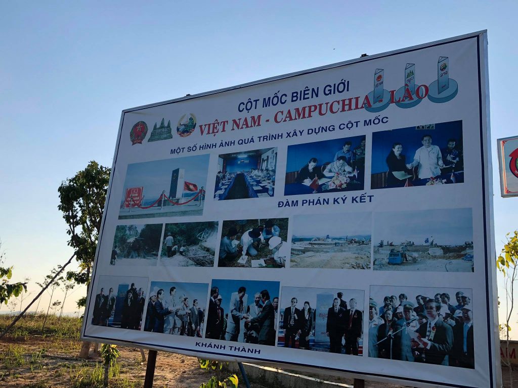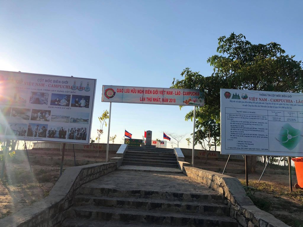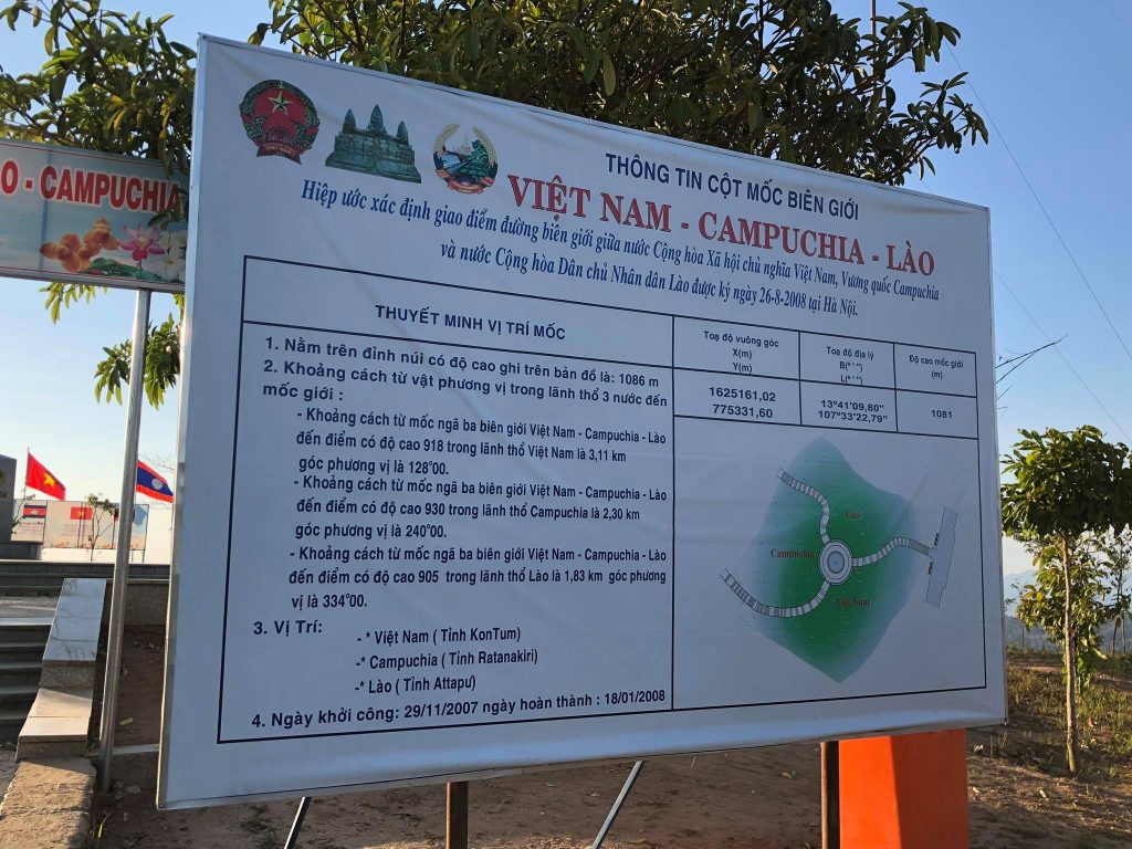 Cột mốc 3 mặt – 3 quốc gia nằm cách Ngã ba Đông Dương khoảng 10 cây số, trên một ngọn đồi cao 1.068m.