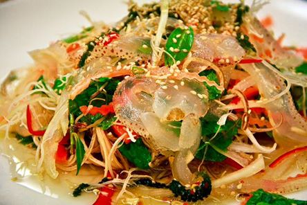 Món gỏi sứa ở Đồ Sơn em thấy chưa nơi nào có, có nhiều cách chế biến hỏi sứa, nhưng ngon nhất là trộn với rau thơm, chanh ớt thêm chút đường, bà con địa phương cũng hay dùng quả của cây sú vẹt để muối sứa, lúc đó con sứa có màu đỏ rất đẹp mắt, ăn chua ngon. Món này giúp thải độc rất tốt nên có thời gian thương lái tàu khựa sang mua giá cao làm bà con bỏ hết đi bán sứa, giờ thì bình thường rồi, khách du lịch có thể ăn với giá phải chăng (khoảng 100k/đĩa).