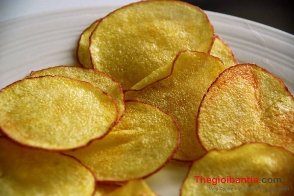 Xắt lát khoai tây thành miếng mỏng, ngâm trong nước khoảng 10 phút, sau thấm khô từng lát khoai tây bằng khăn giấy. Tiếp đó cho khoai vào lò vi sóng, đợi chừng 3 phút là đã có được món khoai tây chiên giòn tan ăn vặt rồi.