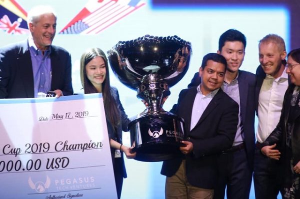 Hoàng Anh đại diện công ty nhận giải thưởng 1 triệu USD tại cuộc thi Startup World Cup. Ảnh: Abivin.