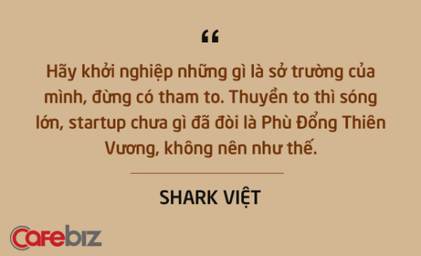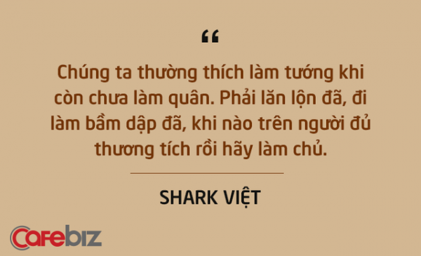 “Chúng ta thường thích làm tướng khi còn chưa làm quân. Phải lăn lộn đã, đi làm bầm dập đã, khi nào trên người đủ thương tích rồi hãy làm chủ”, Shark Việt nhắn nhủ. Tuy chỉ xuất hiện 4 tập trong Shark Tank Việt Nam, nhưng Shark Việt đã để lại nhiều lời khuyên quý báu từ chuyện khởi nghiệp đến chuyện xây dựng văn hoá công ty…