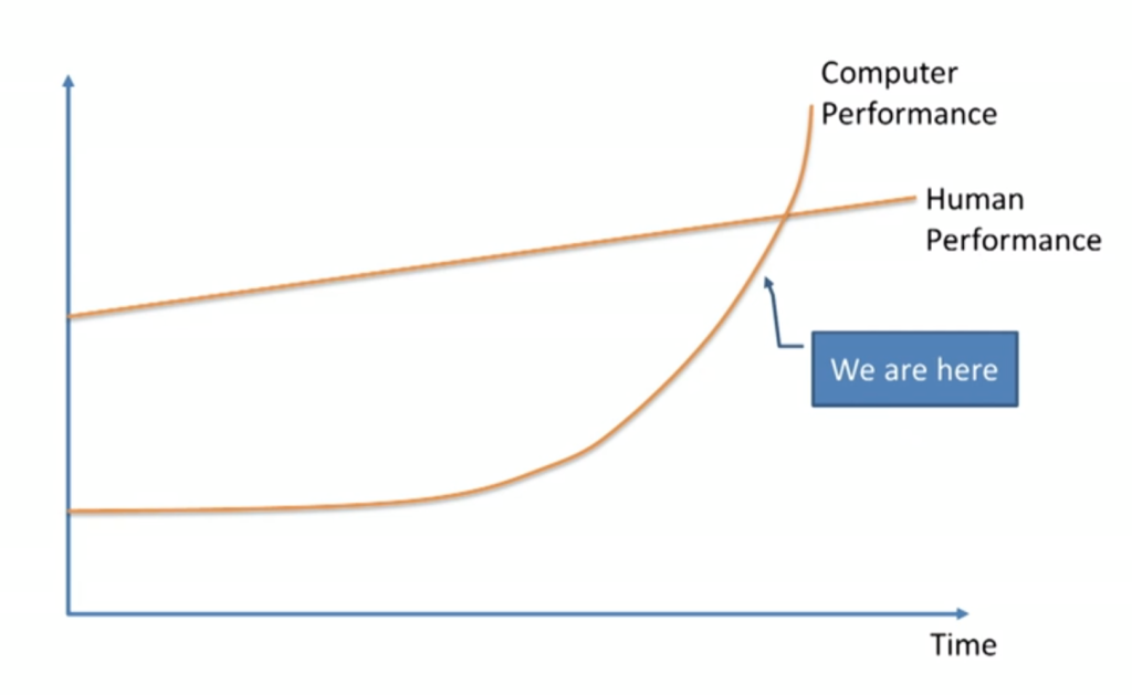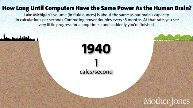 Vậy là những chiếc máy tính giá 1000 đô hiện nay đã vượt qua ngưỡng bộ não chuột và đang ở khoảng một phần nghìn bộ não người. Nghe thì chẳng thấm vào đâu, cho tới khi bạn nhớ ra là chúng ta chỉ đạt mức một phần nghìn tỉ vào năm 1985, rồi thì một phần tỷ năm 1995, và rồi một phần triệu vào năm 2005. Đạt được mốc một phần nghìn vào năm 2015 đặt chúng ta vào đúng quỹ đạo để tiến tới việc sở hữu một cỗ máy tính với giá phải chăng và năng lực tính toán xấp xỉ ngưỡng loài người.