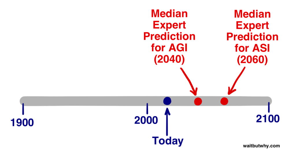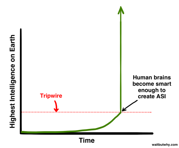 Nhưng có đủ các loại chính phủ, công ty, quân đội, phòng thí nghiệm khoa học, và các tổ chức chợ đen làm việc để tạo ra đủ các loại AI. Rất nhiều trong số họ đang cố gắng tạo ra AI biết tự tiến bộ, và một lúc nào đó, ai đó sẽ làm được điều gì đó đủ tiên tiến với đúng loại hệ thống, và chúng ta sẽ có ASI trên hành tinh này. Chuyên gia trung bình đặt thời điểm đó vào năm 2060, Kurweil đặt vào năm 2045; Bostrom nghĩ nó có thể xảy ra bất kỳ lúc nào dao động từ 10 năm kể từ bây giờ và cuối thế kỷ này, nhưng ông tin rằng vào lúc đó, nó sẽ đánh úp chúng ta bằng một cuộc cất cánh nhanh chóng. Ông mô tả tình cảnh của chúng ta như sau: (21)