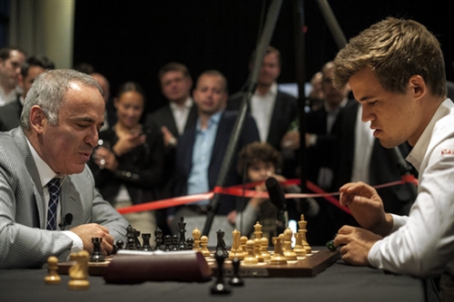 Kasparov (trái) thi đấu với cựu học trò Magnus Carlsen (phải), nhà vô địch thế giới trẻ tuổi nhất lịch sử