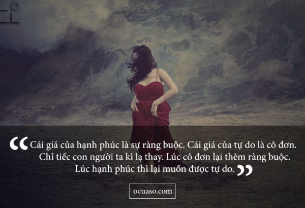 3, Cái giá của hạnh phúc là sự ràng buộc. Cái giá của tự do là cô đơn. Chỉ tiếc con người ta kì lạ thay. Lúc cô đơn lại thèm ràng buộc. Lúc hạnh phúc thì lại muốn được tự do.