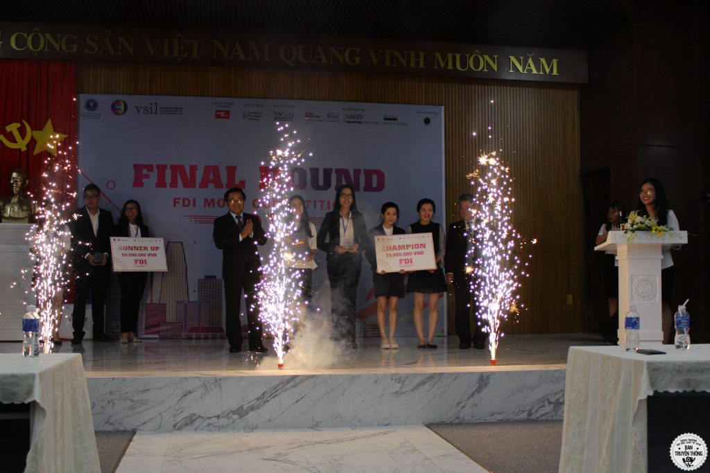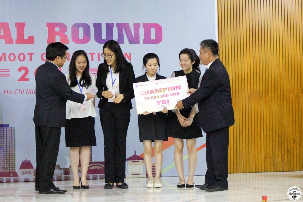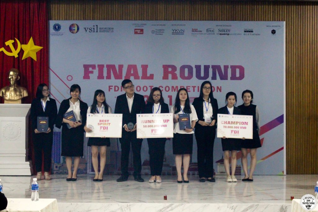 Tiếp đó, đúng 16h00 cùng ngày, Hội trường A.1002 trường ĐH Luật TP. HCM đã đông kín sinh viên cùng khách mời hồi hộp theo dõi vòng Chung kết cuộc thi. Trận đấu cuối đầy nghẹt thở đã kết thúc, gọi tên Nhà vô địch của FDI Moot 2018: đội Guggenheim đến từ Học viện Ngoại giao với phong độ vô cùng xuất sắc. Đội Ajibola đại diện cho trường Đại học Luật TP. HCM hơi tiếc nuối khi chỉ về đích ở vị trí Á quân nhưng vẫn xứng đáng nhận được nhiều lời khen ngợi vì đã chiến đấu bằng tất cả bản lĩnh và tài năng của mình để tạo ra một thế trận cân bằng.