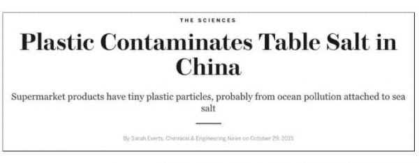 Từng có cơ quan truyền thông chỉ ra: ở Trung Quốc, thực khách dùng muối biển có thể phải hấp thu vào cơ thể rác nhựa các loại một cách vô thức. Thông tin dẫn nghiên cứu phân tích từ 15 loại muối phổ biến được mua tại các siêu thị trên khắp Trung Quốc, theo đó nghiên cứu đã thấy rằng trong muối có polyethylene terephthalate, polyethylene, giấy bóng kính và các loại nhựa khác được sử dụng để sản xuất chai nước bằng nhựa thông thường.