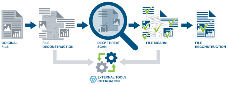 - Content Disarm: Đây chỉ việc loại bỏ các thành phần không phù hợp với chính sách được định nghĩa cho từng loại file. Các phần này thường là các macro, các đoạn mã thực thi có trong file.