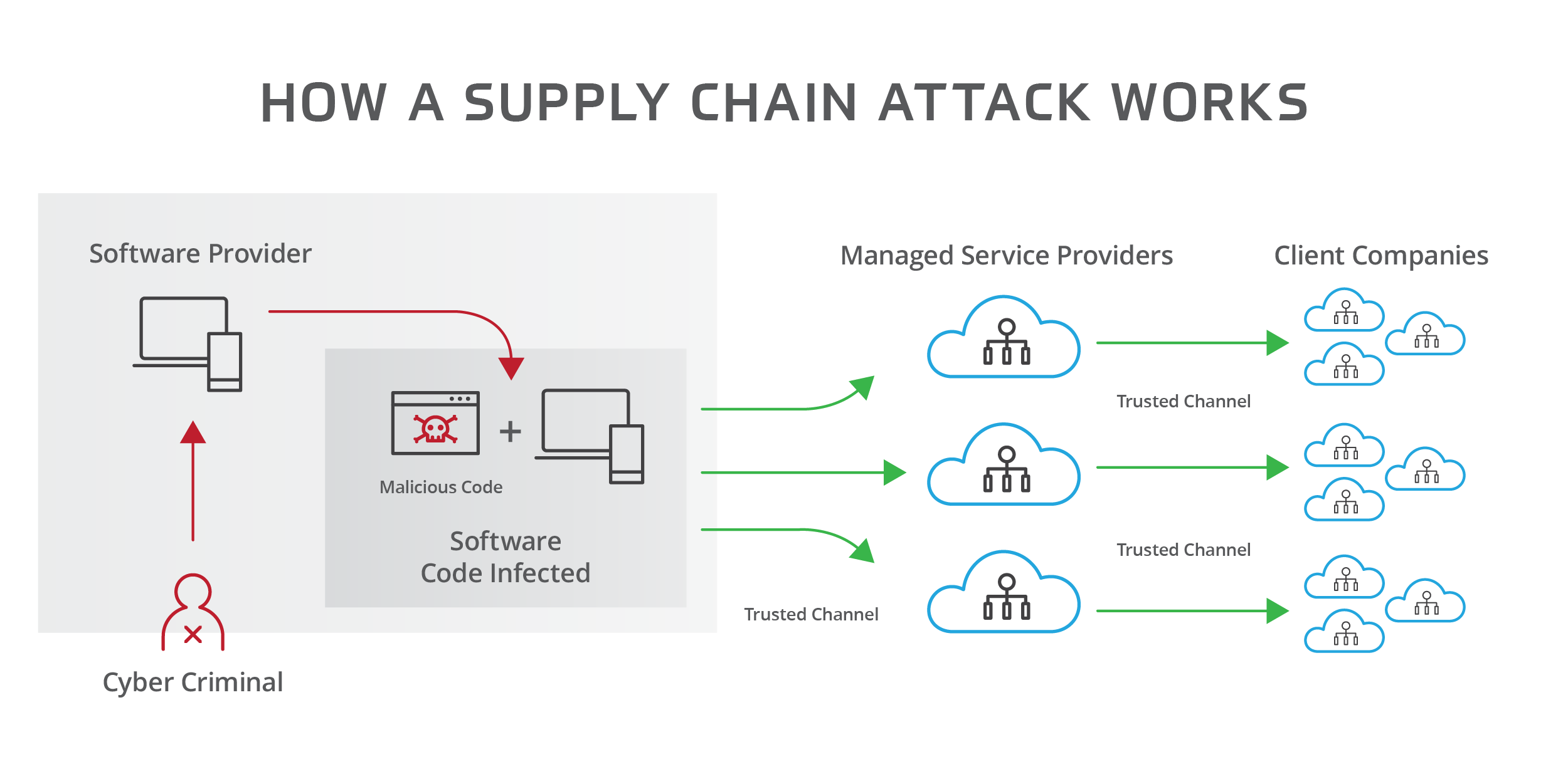 Nếu so việc tin tặc tấn công vào chuỗi sẽ chỉ ảnh hưởng đến những công ty nằm trong chuỗi ấy, thì việc bọn chúng tấn công vào nhà cung cấp dịch vụ công nghệ thông tin sẽ nguy hiểm hơn gấp nhiều lần, vì lần này đối tượng bị ảnh hưởng là các tổ chức đang sử dụng những giải pháp từ những nhà cung cấp dịch vụ này.