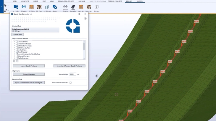 Một công cụ kết nối mới giữa TS và Quadri giúp dữ liệu được kết nối trực tiếp và hai chiều trong việc chia sẻ dữ liệu giữa kỹ sư Tekla và kỹ sư cầu đường. Bạn có thể chia sẽ dữ liệu về đường hoặc tuyến mới nhất, cũng như chia sẻ dữ liệu mô hình cầu lên Quadri |