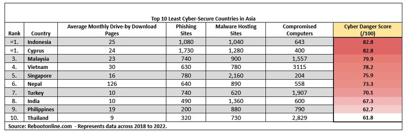 Một báo cáo về thực trạng thiếu an toàn trên không gian mạng được công bố gần đây cho thấy Việt Nam nằm trong top 10 quốc gia có chỉ số an ninh mạng kém nhất Châu Á cũng như thế giới. Nghiên cứu được thực hiện bởi Reboot Digital PR Services có trụ sở tại Vương quốc Anh, một công ty hoạt động trong lĩnh vực Internet. Theo số liệu được công bố, Việt Nam nằm ở vị trí thứ 4 trong bảng xếp hạng, xếp trên Indonesia và Malaysia tại Đông Nam Á.
