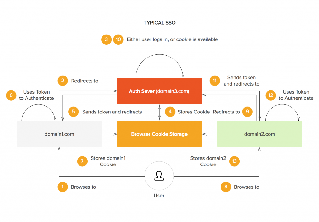 Bất cứ khi nào người dùng tới một domain yêu cầu phải xác thực, anh ta hay cô ta sẽ được chuyển đến domain xác thực (authentication domain). Nếu người dùng đã đăng nhập tại domain xác thực, họ sẽ ngay lập tức được chuyển hướng trở lại domain gốc với token để xác thực các request tiếp theo.