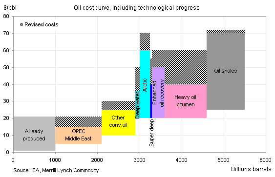 Có nhiều lý do để dự đoán về một mức giá thấp trong khoảng 20-50 USD/thùng như trong giai đoạn năm 1986-2004. Công nghệ khai thác phát triển và áp lực ô nhiễm môi trường đang làm giảm nhu cầu dầu mỏ trong dài hạn và có nguy cơ đưa những mỏ dầu thô có chi phí khai thác cao ngoài Trung Đông thành một “mỏ vàng hoang”, tương tự những mỏ than không được khai thác trên thế giới.