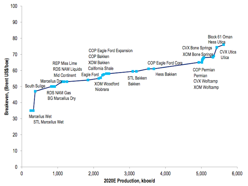 Biểu đồ dưới đây của CitiGroup cung cấp mức giá hòa vốn cho tất cả các dự án khai thác dầu đá phiến lớn. Với giá 50 USD/thùng, giá dầu thô đã nằm dưới mức có lợi nhuận của hầu hết các dự án. Điều này có nghĩa là trên lý thuyết thì các dự án này nên giảm khai thác.