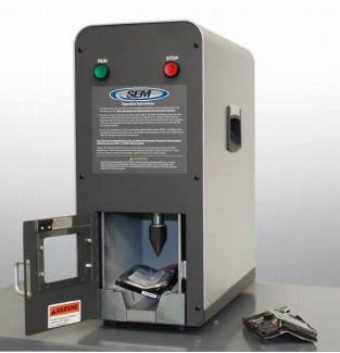 Máy nghiền SEM Model SSD1-HS đưa các thiết bị ở trạng thái rắn về các hạt có kích thước ≤1 mm² và đáp ứng Tiêu chuẩn DIN 66399 E-7. Sự phá hủy tuyệt đối thông qua việc cắt phương tiện lưu trữ nhiều lần ở tốc độ cao đảm bảo tất cả dữ liệu được hủy triệt để, đúng cách. Model SSD1-HS phá hủy bo mạch trạng thái rắn, RAM, linh kiện điện thoại thông minh/điện thoại di động, thẻ SIM, ổ đĩa flash USB, thẻ nhớ và thậm chí cả đĩa quang. Người dùng cần lưu ý: các phương tiện lưu trữ SSD phải được tháo rời khỏi vỏ trước khi tiêu hủy.